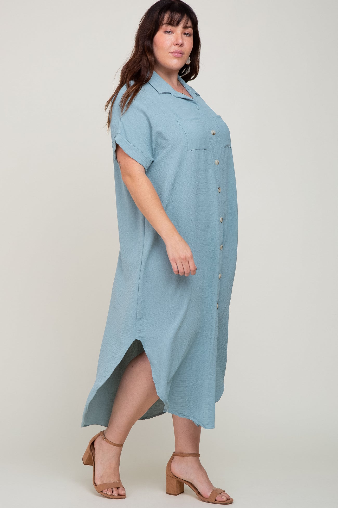 A solid plus maxi dress featuring functioning front buttons, a collar, two front pockets, cuffed short dolman sleeves, and a hi-low rounded hemline.