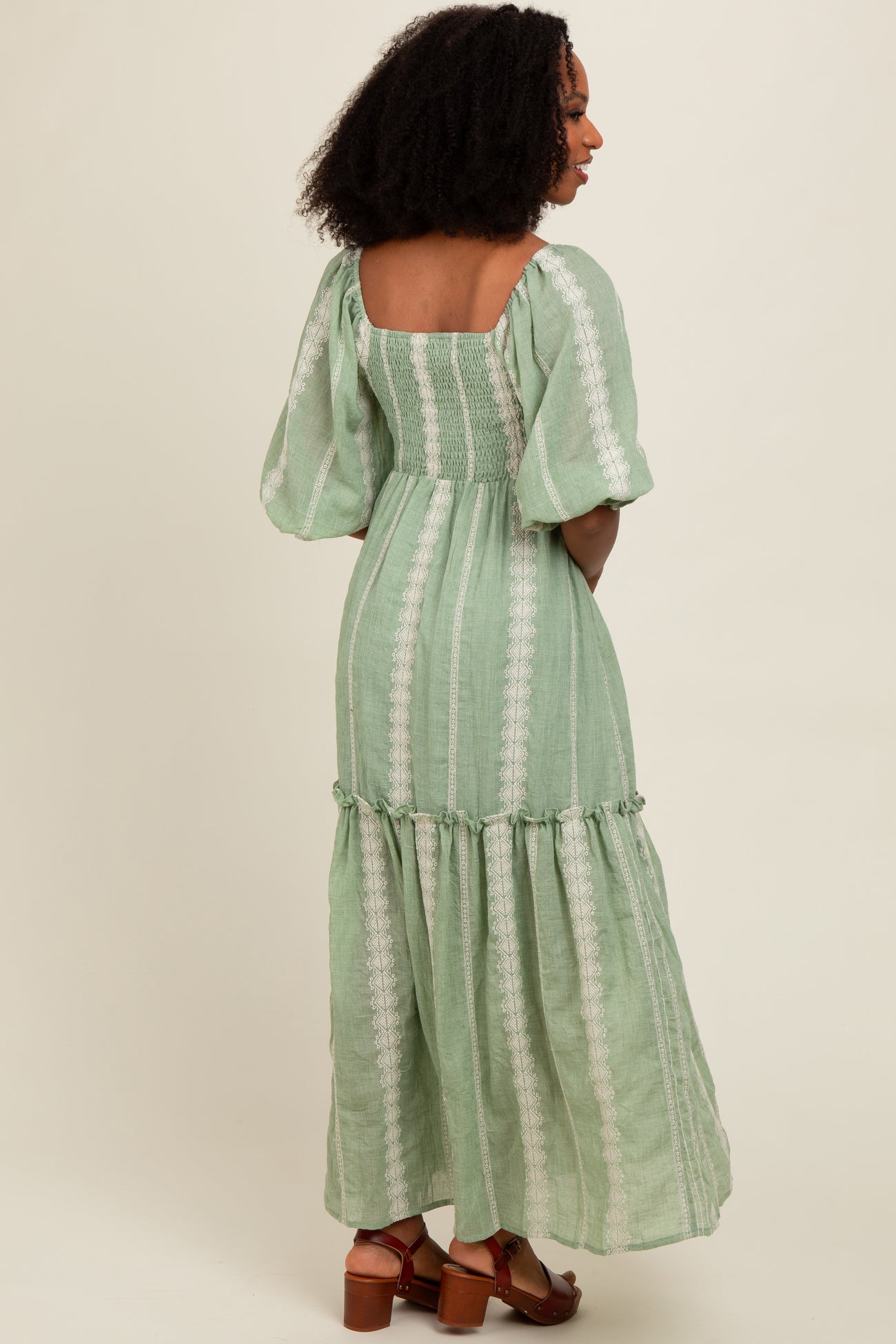 Light Olive Embroidered Detail Smocked Top Maxi Dress