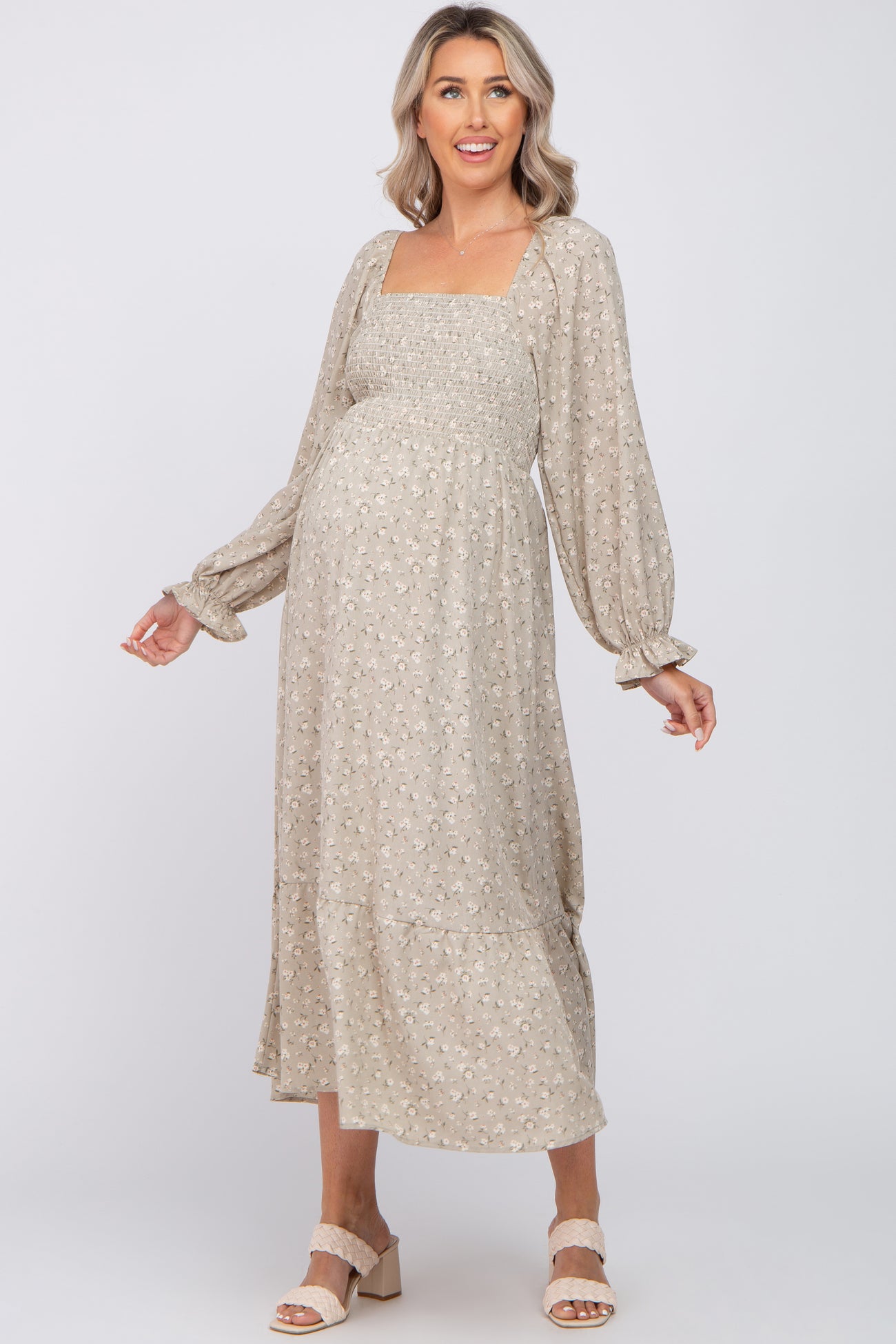 Details A floral maternity midi dress featuring a squared neckline, long cinched sleeves, a smocked bodice, and a gathered bottom tier. Content + Care