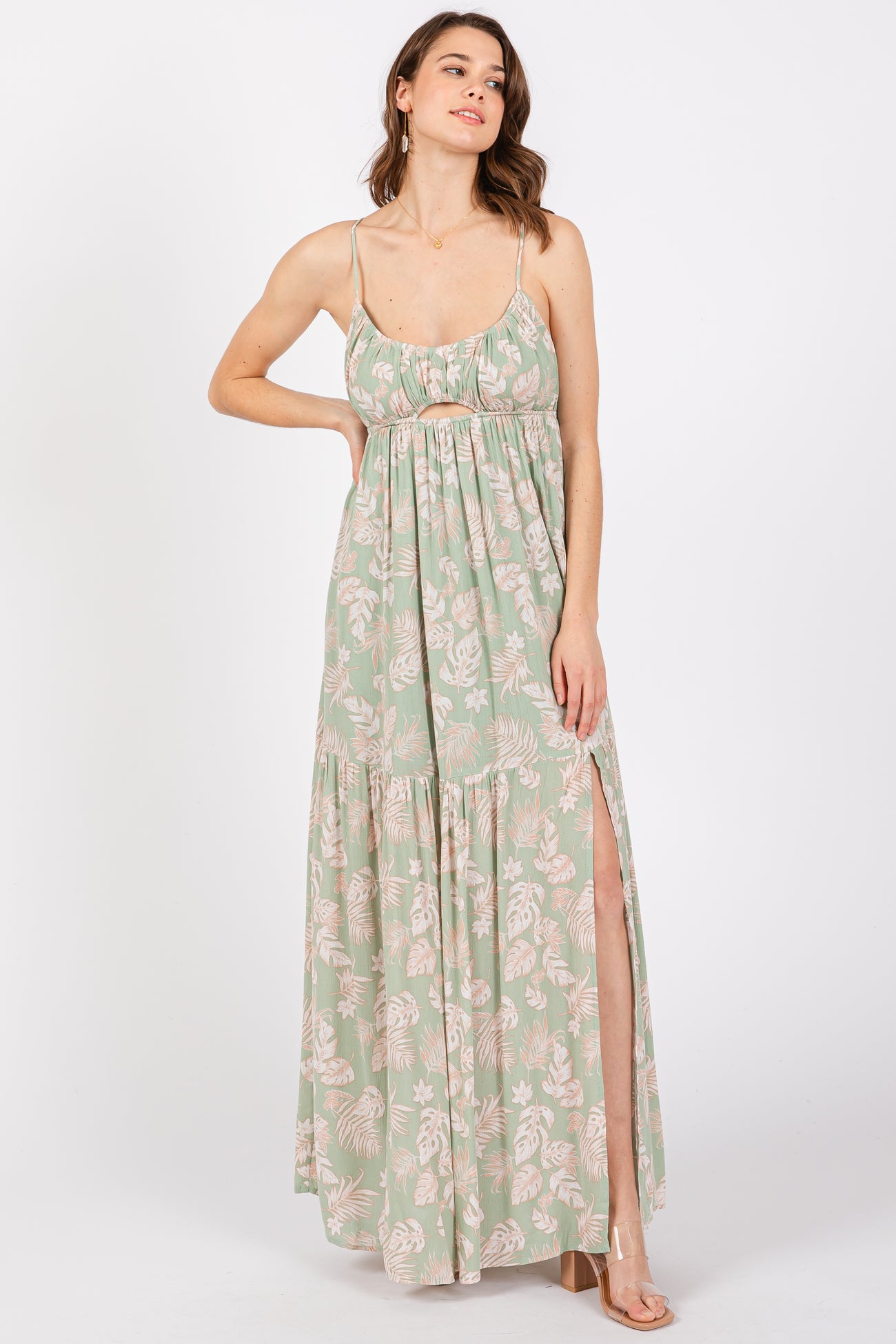 Light Olive Foral Front Cutout Open Cross Back Maternity Maxi Dress