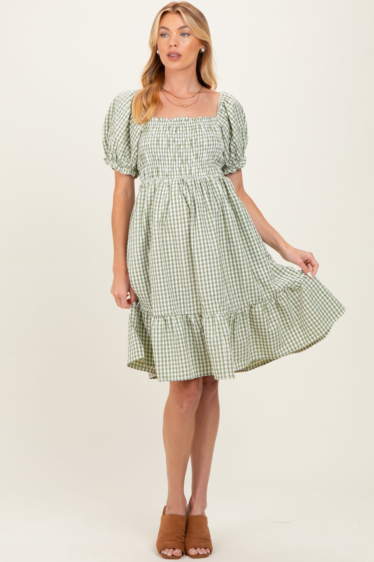 Light Olive Gingham Smocked Puff Sleeve Maternity Dress