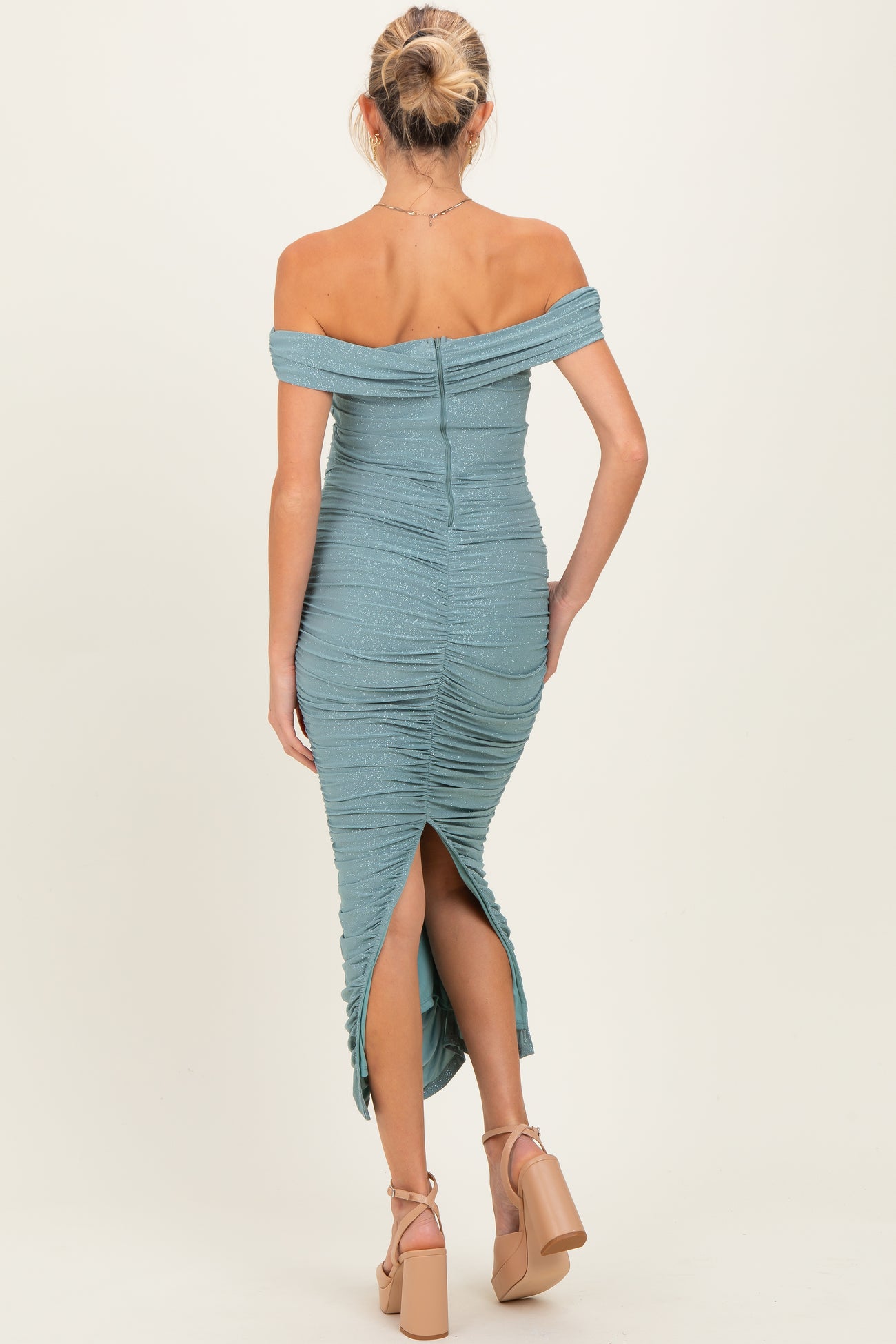 Light Olive Glitter Ruched Off Shoulder Maternity Midi Dress
