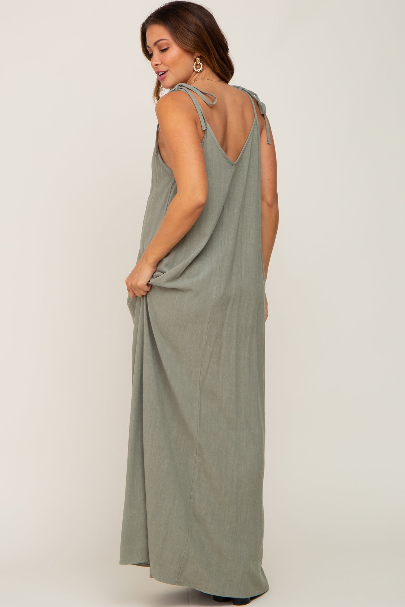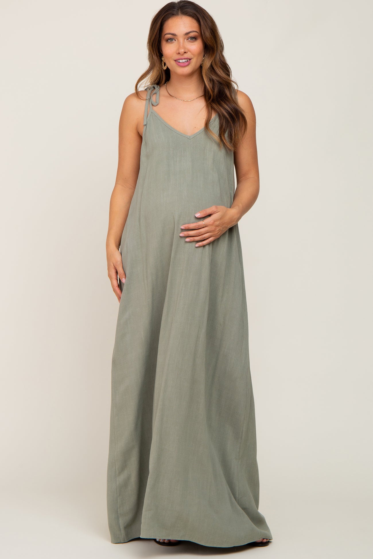 Light Olive Linen V-Neck Tie Strap Maternity Maxi Dress