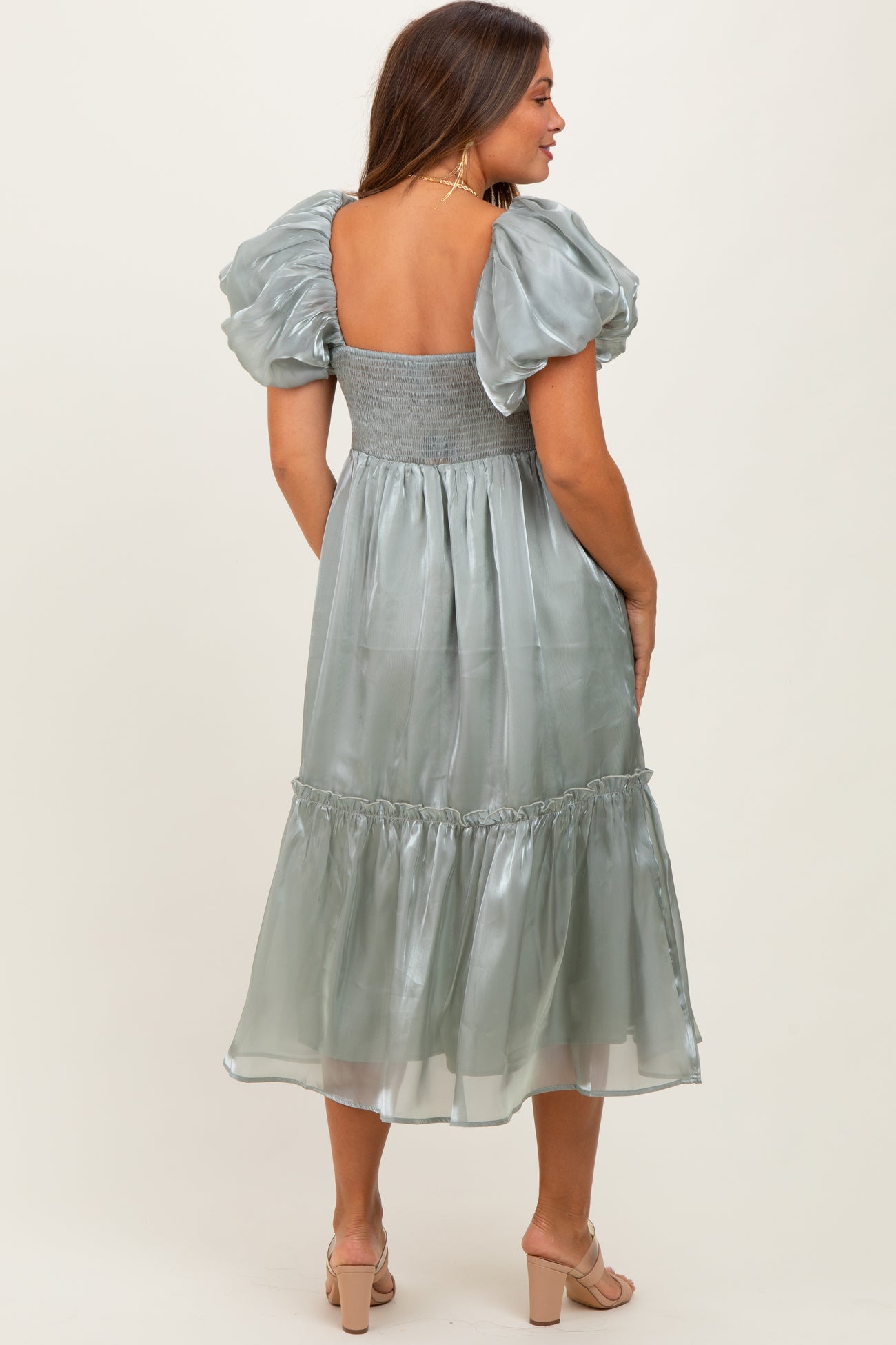 Light Olive Organza Puff Sleeve Maternity Midi Dress