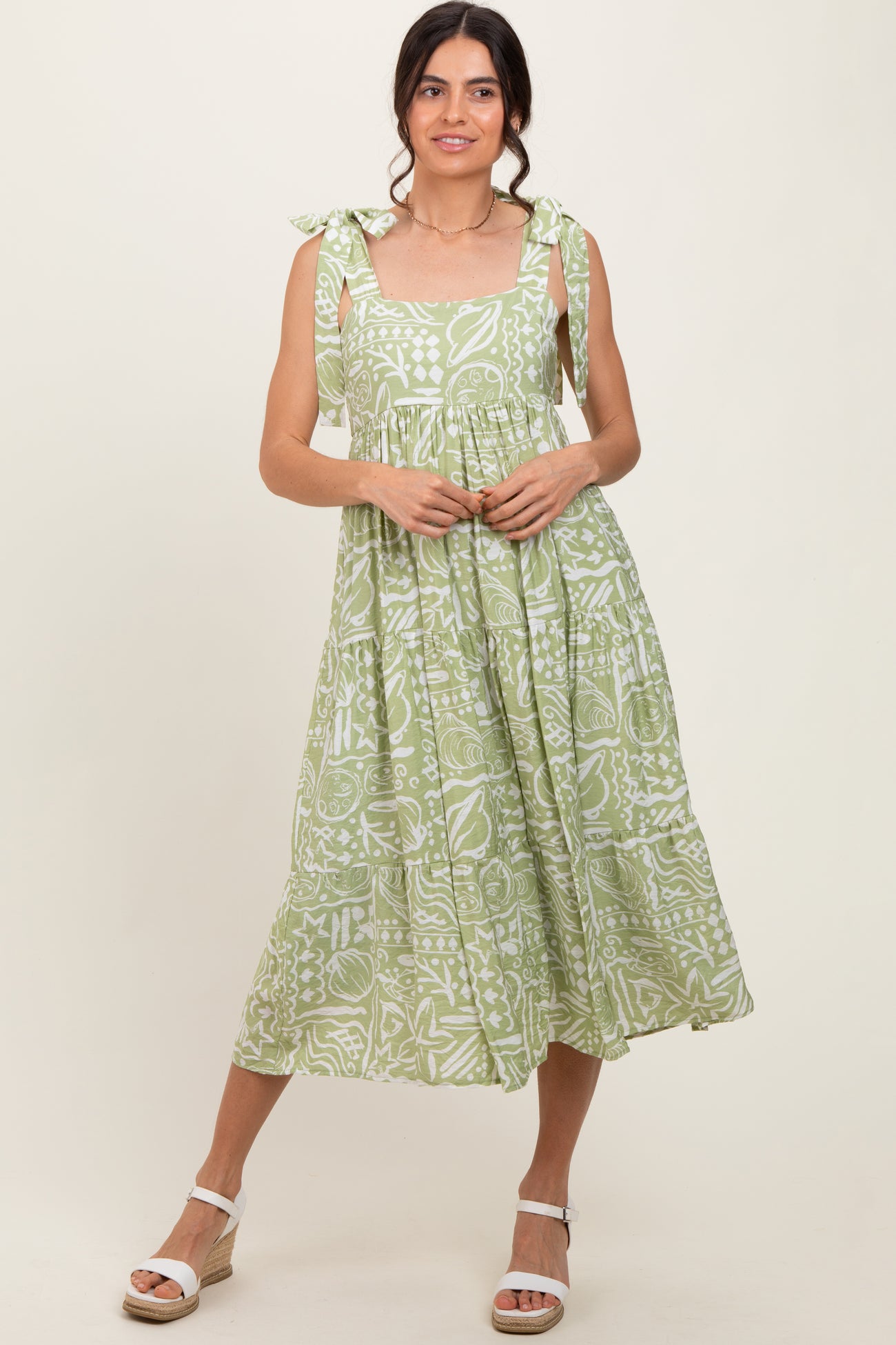 Light Olive Printed Tie Strap Tiered Midi Dress