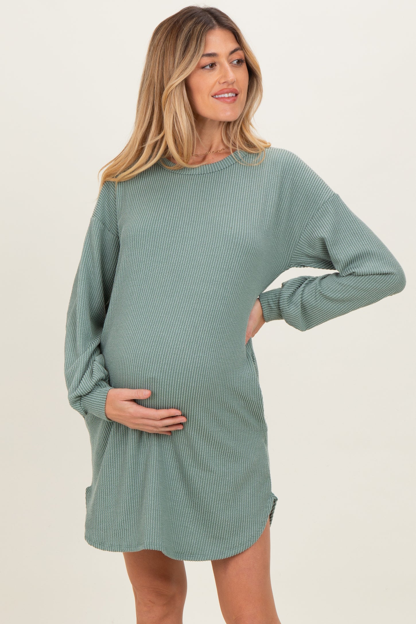 Light Olive Rib Knit Long Sleeve Maternity Dress