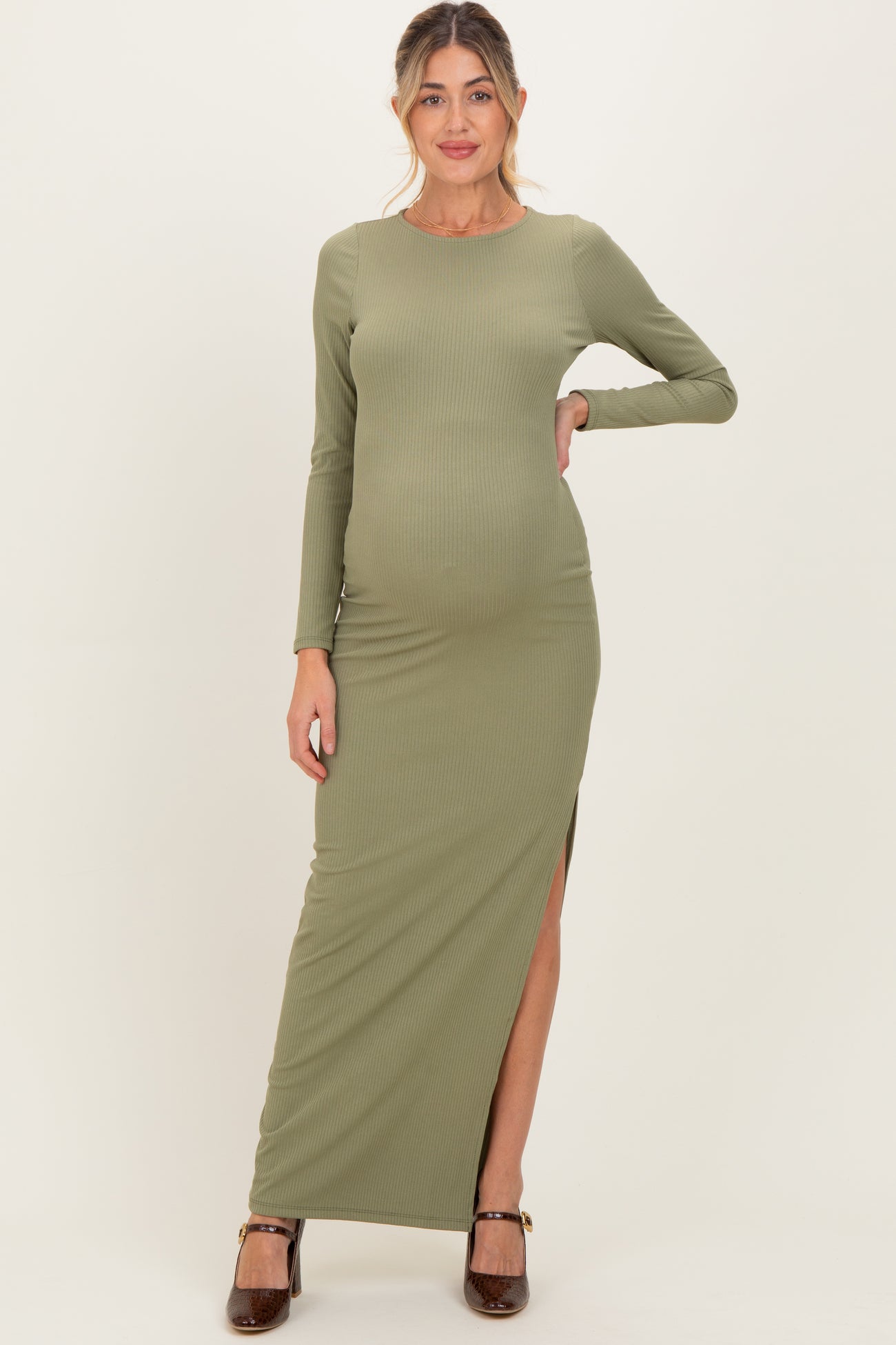Light Olive Ribbed Long Sleeve Side Slit Maternity Maxi Dress