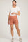 A pair of solid active maternity shorts featuring a curved slit hem and an elastic waistband.