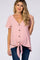 A solid hued maternity top featuring a button accent on front, a tie accent on hemline, a v-neckline, and short sleeves.