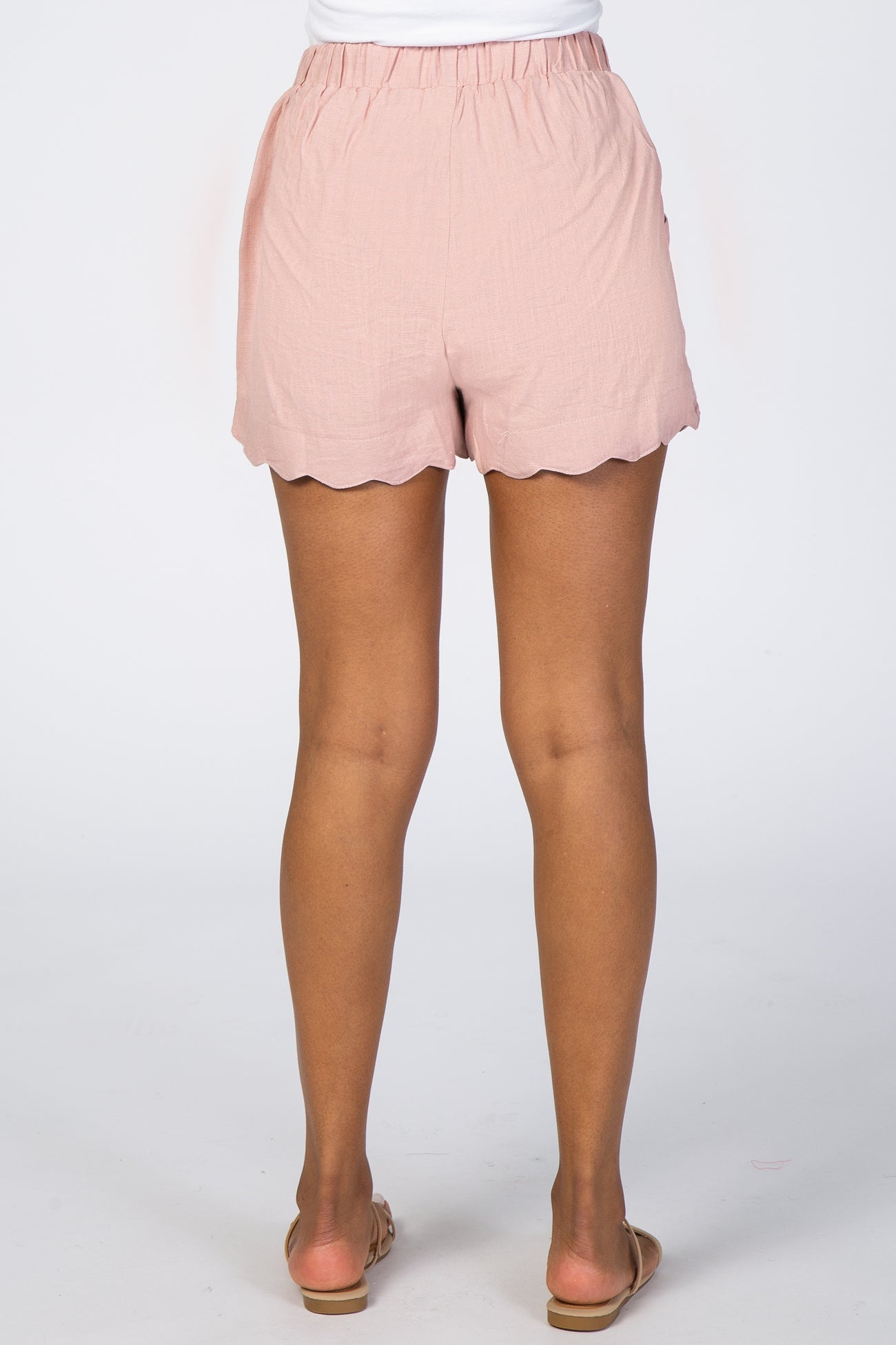 A pair of linen shorts featuring a scalloped hem, side pockets, and an elastic waistband.