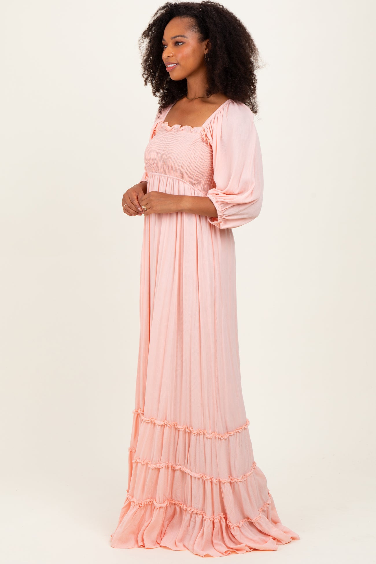 Light Pink Solid 3/4 Sleeve Smocked Top Tiered Maxi Dress