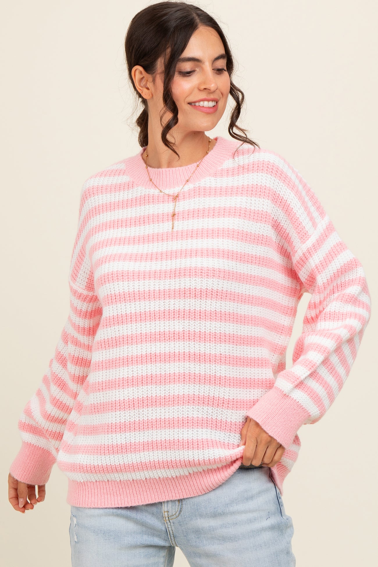 Light Pink Striped Crew Neck Sweater