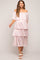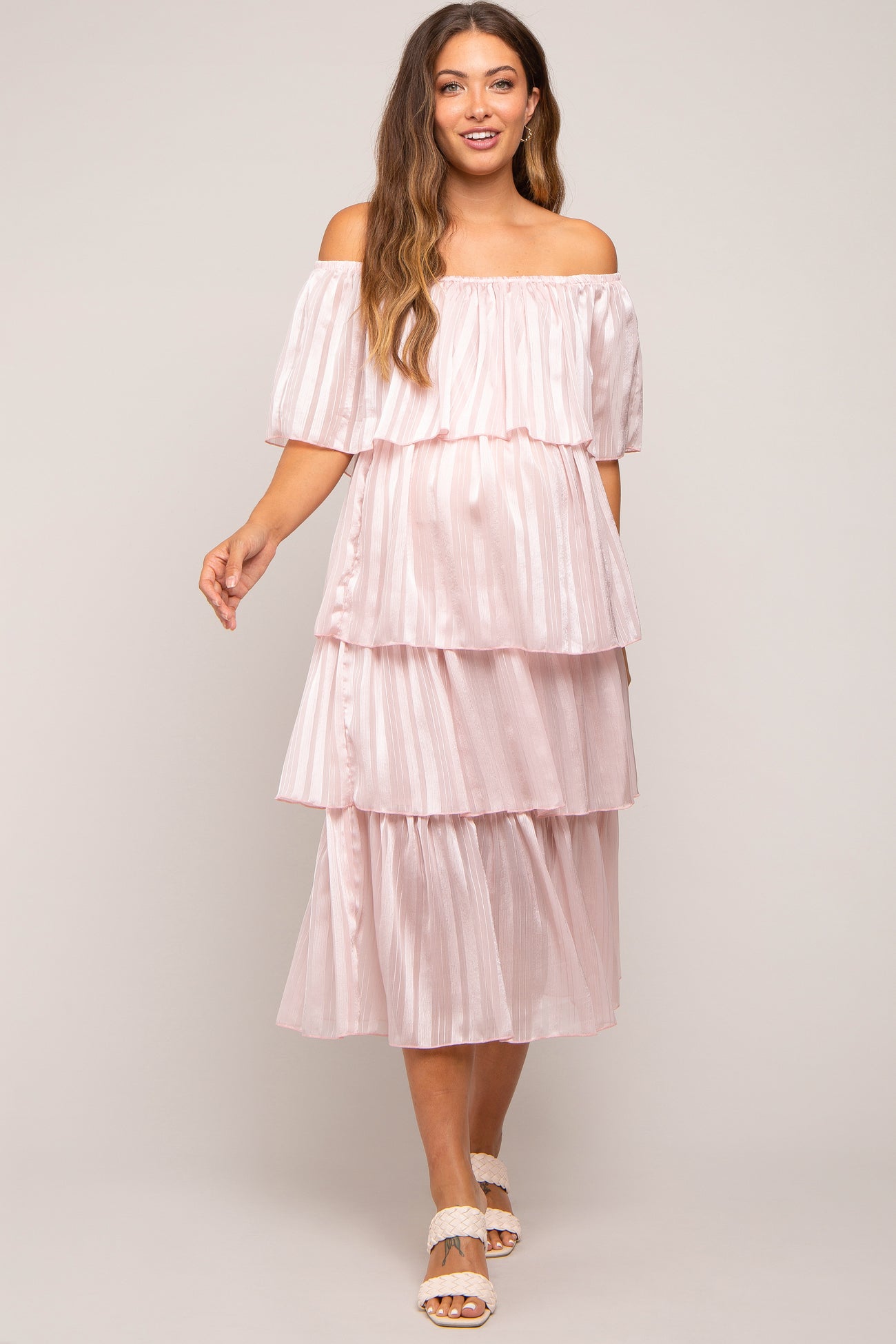 A striped maternity midi dress featuring an off the shoulder neckline, a flounce top, and a layered body.