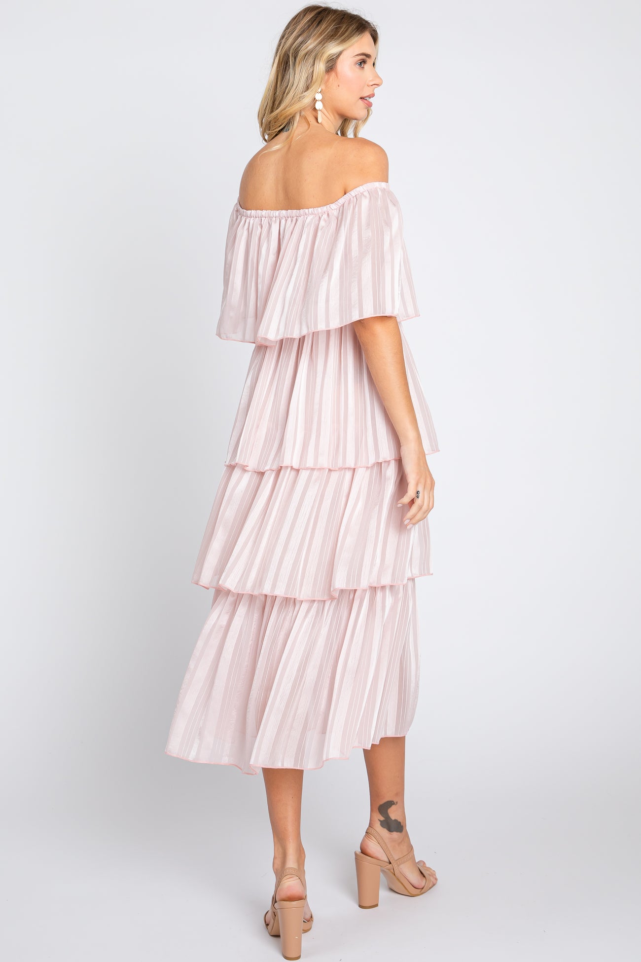 A striped midi dress featuring an off the shoulder neckline, a flounce top, and a layered body.