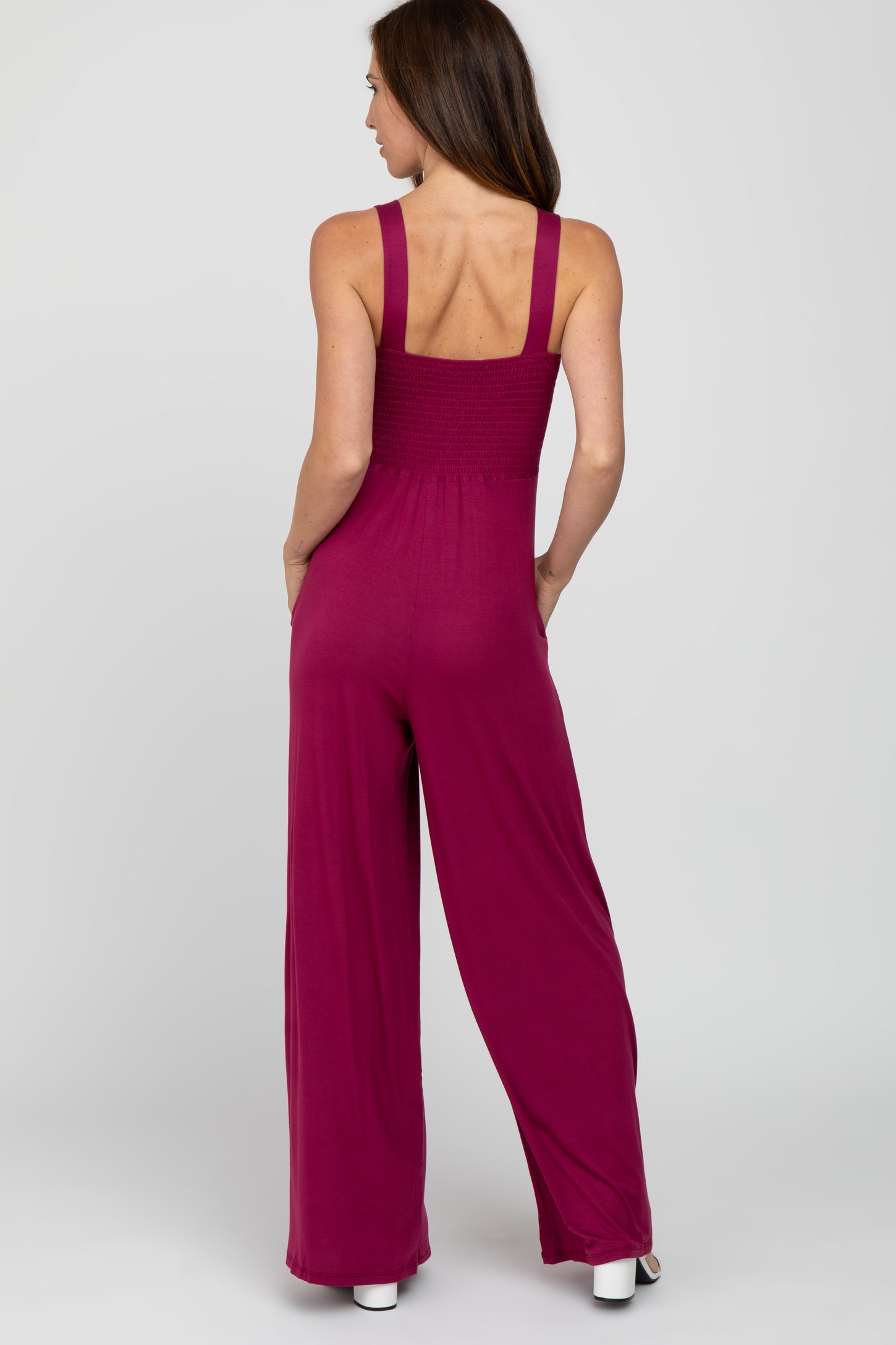 Details A sleeveless jumpsuit featuring a smocked bust, side pockets, and wide legs. Content + Care