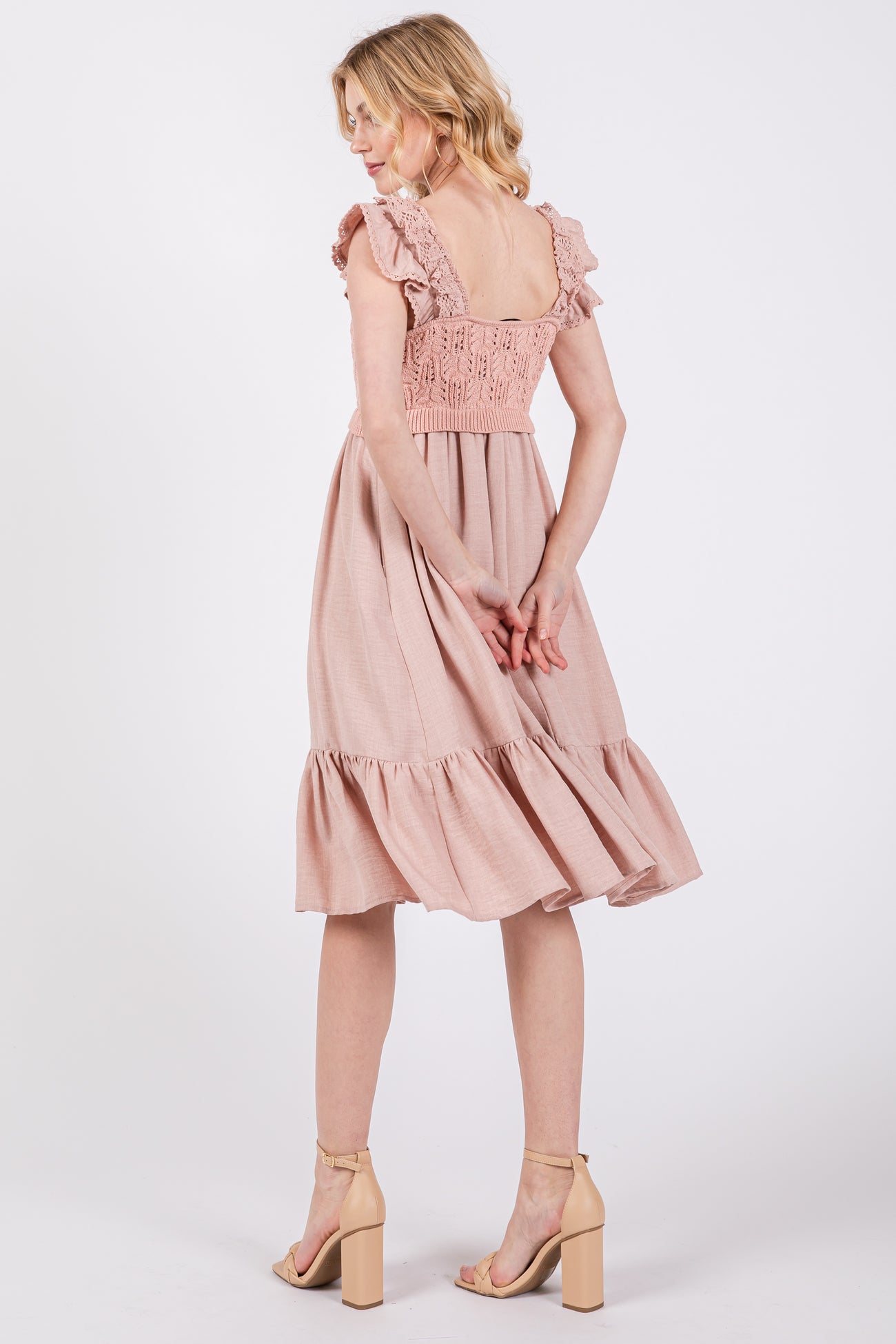 Details A knee-length dress with a squared neckline, ruffle accent straps, side pockets, and a gathered bottom tier. Features a crochet knit top and is fully lined. Content + Care