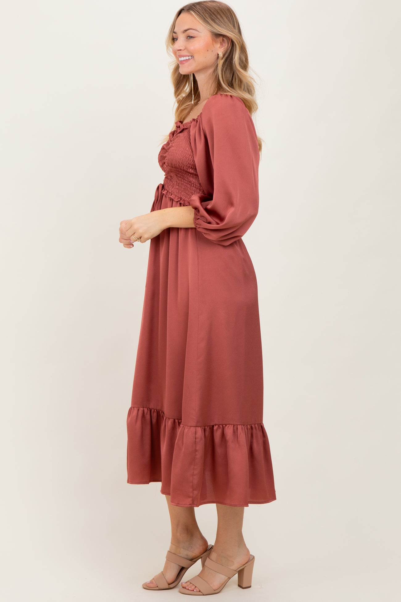 Elevate your wardrobe with our Mauve Satin Smocked Cinched Bust Midi Dress. Crafted from smooth satin fabric, this dress features a flattering smocked bust with a cinched tie detail that enhances your silhouette. The midi length and ruffled hem add a touch of elegance, while the puffed 3/4 sleeves bring a romantic vibe. Perfect for both casual outings and special occasions, its soft mauve hue complements any skin tone beautifully. Pair with heels or sandals for a chic, effortless look. Comfortable, stylish, and versatile—this dress is a must-have for your seasonal collection!