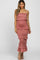 A solid satin midi dress featuring a smocked elastic body with ruffle trim and adjustable cami straps.