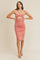 A solid fitted ruched midi dress with front cutout and strap details. Dress is lined.