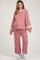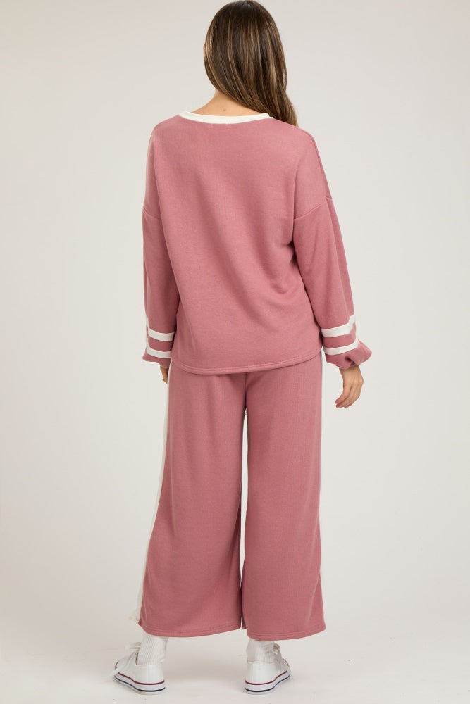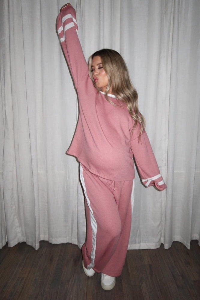 A striped maternity set featuring long sleeves and long pants with a self-tie drawstring.