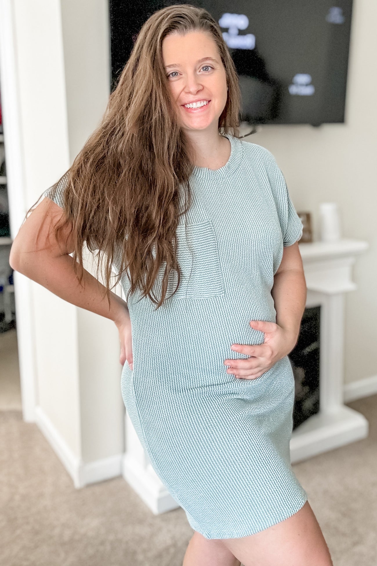 Mint Green Ribbed Front Pocket Dolman Short Sleeve Maternity Dress