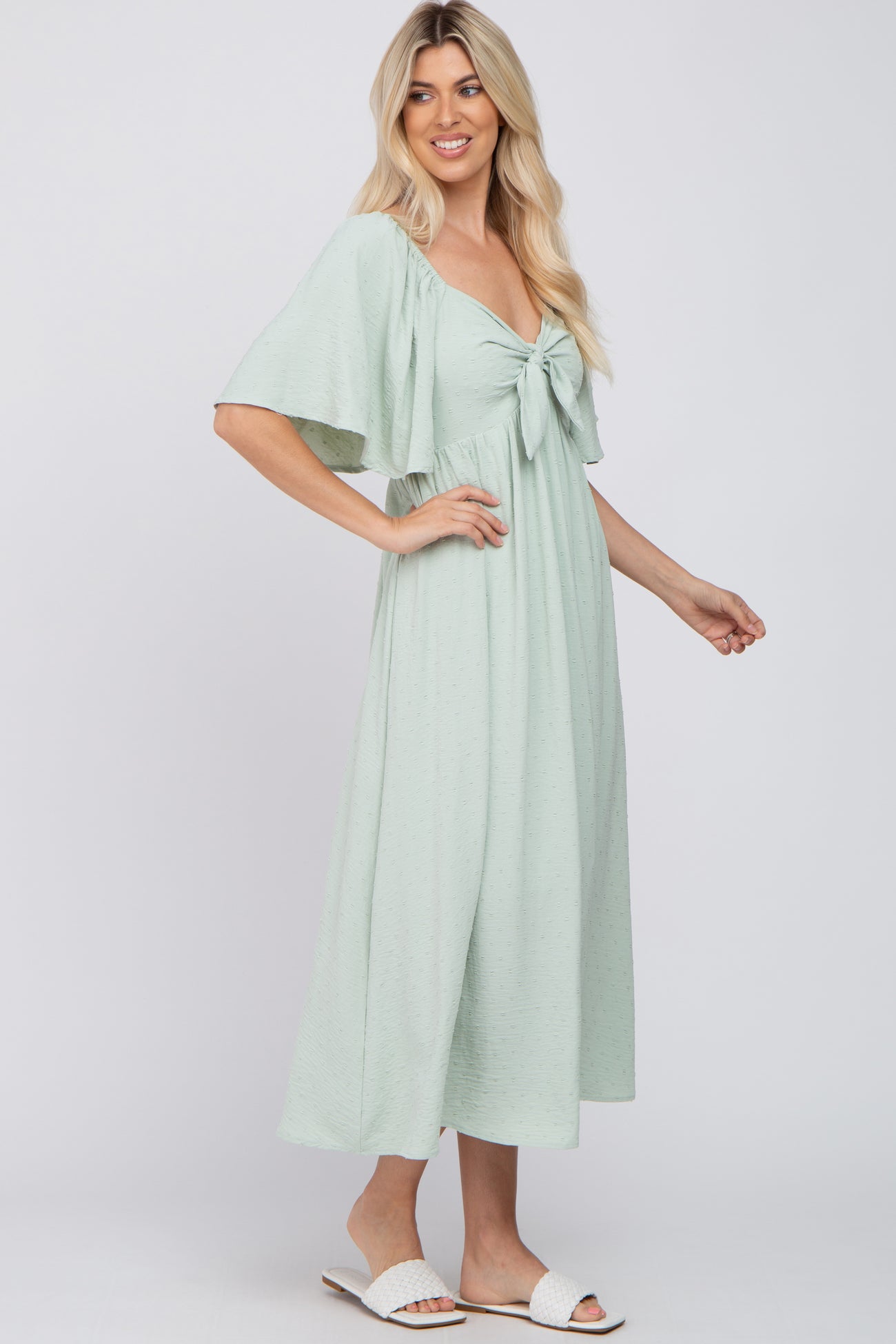 Mint Green Textured Dot Front Tie Ruffle Sleeve Midi Dress