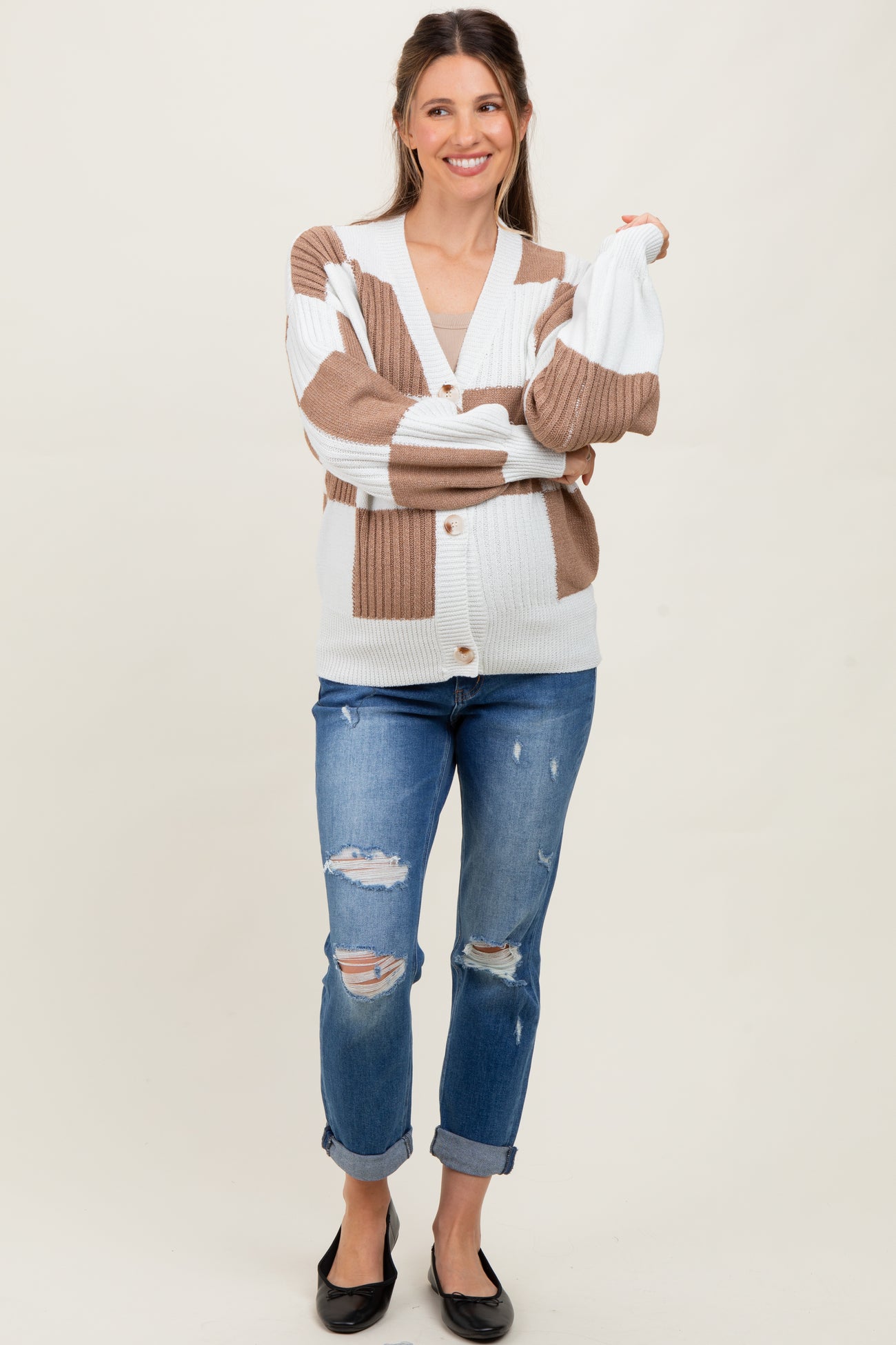 Stay cozy and stylish throughout your pregnancy with our Mocha Checkered Rib Bubble Sleeve Button Maternity Cardigan. Featuring an eye-catching checkered pattern in soothing mocha and white tones, this cardigan adds a chic touch to any maternity outfit. The ribbed texture and bubble sleeves create a trendy silhouette while offering comfortable stretch to accommodate your growing bump. With easy button closures and a soft V-neckline, it's perfect for layering over tees or dresses. Crafted to keep you warm and fashionable from bump to beyond, this cardigan is a must-have addition to your maternity wardrobe.