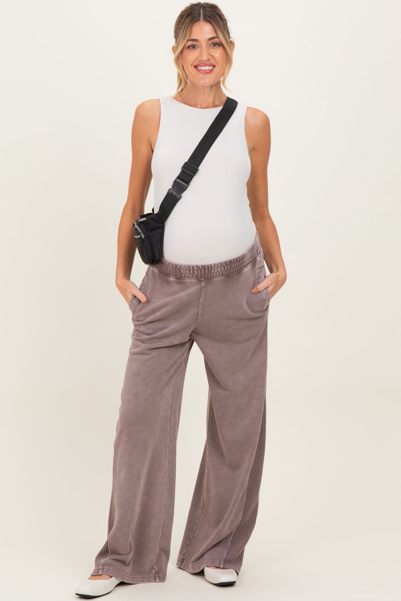 Experience ultimate comfort and style with our Mocha Mineral Wash Waffle Knit Contrast Maternity Lounge Pants. Crafted from ultra-soft, breathable fabric, these pants gently stretch to accommodate your growing bump while providing a relaxed wide-leg fit. The unique waffle knit panels along the sides add a modern touch to the cozy mineral wash design. Featuring an elastic waistband for an adjustable fit and handy side pockets for essentials, these lounge pants are perfect for both relaxing at home and casual outings. Embrace effortless maternity style with these versatile, must-have lounge pants.