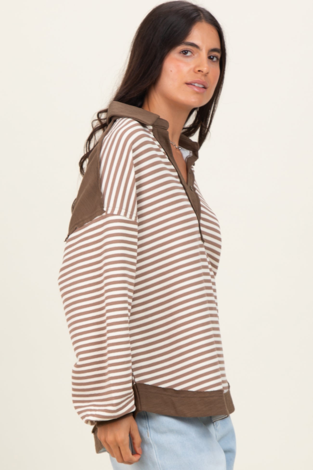 Mocha Striped Oversized Collared Pullover Top