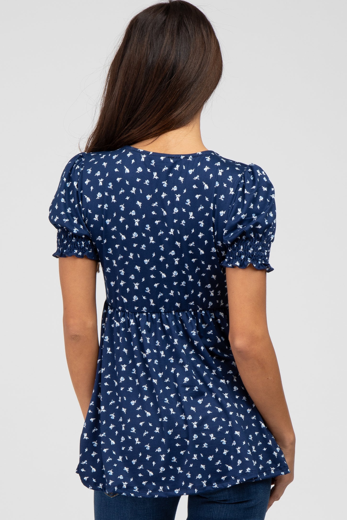 Navy Ditsy Floral Smocked Sleeve Wrap Top
