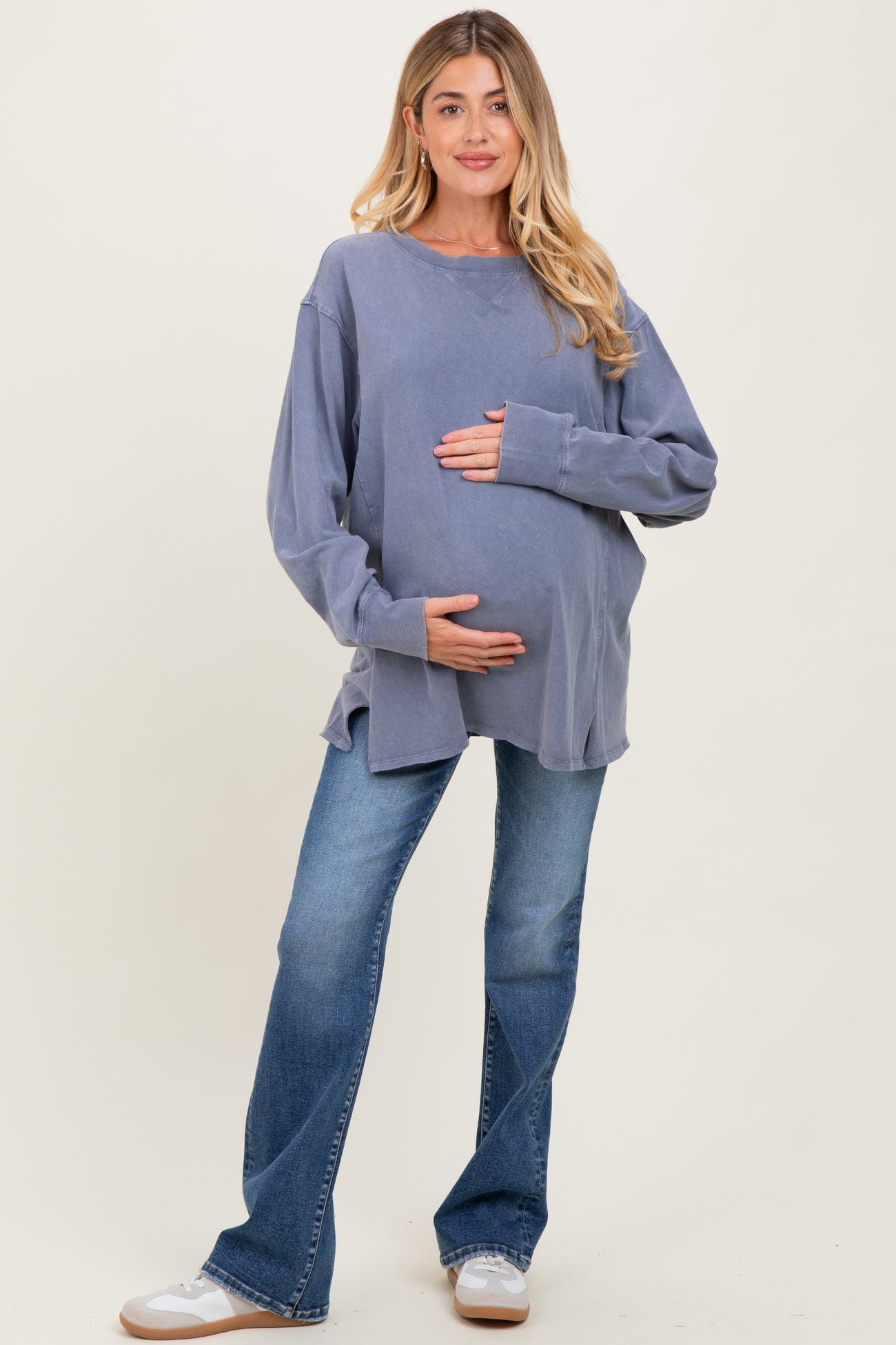 Navy Mineral Washed Drop Shoulder Long Sleeve Maternity Top
