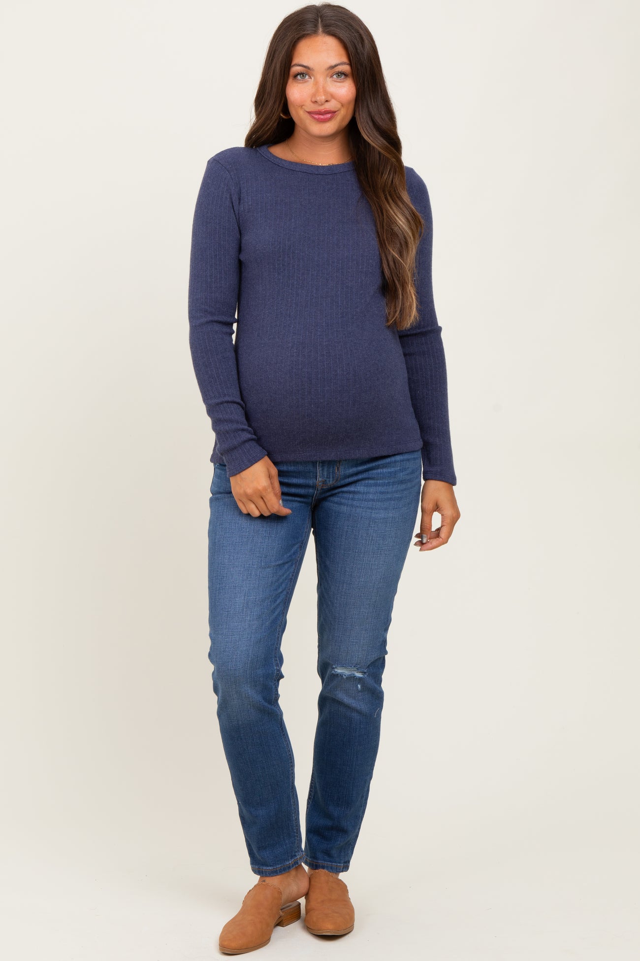 Navy Ribbed Knit Maternity Long Sleeve Top