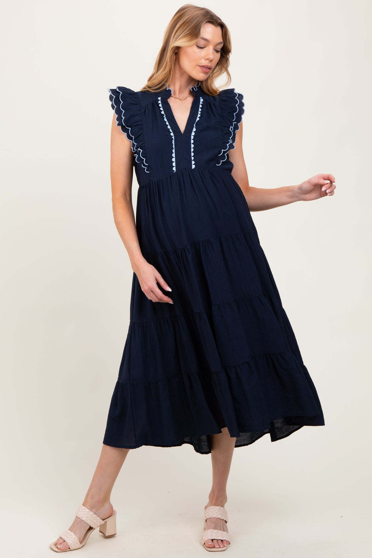 Navy Scallop Detail Tiered Maternity Midi Dress