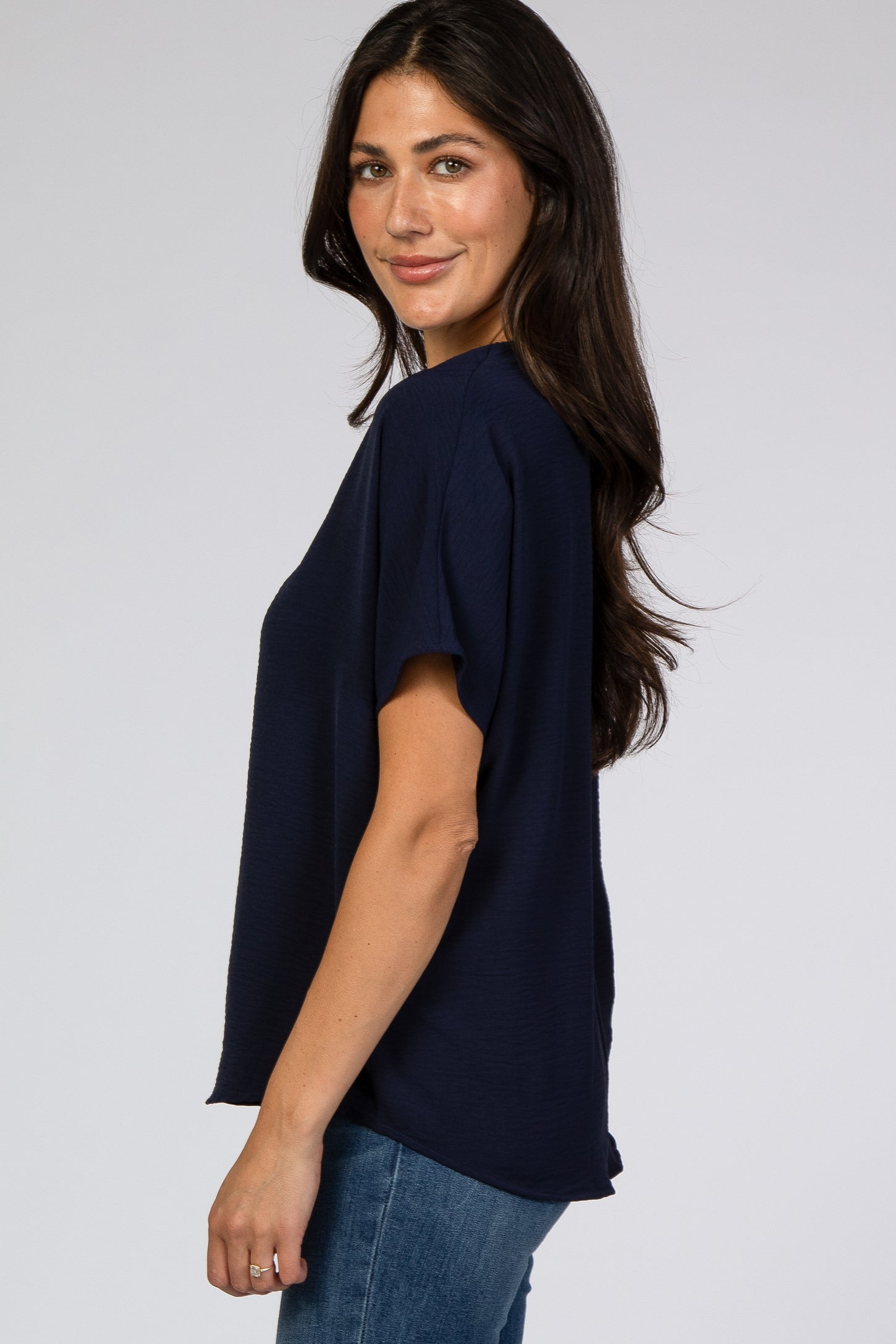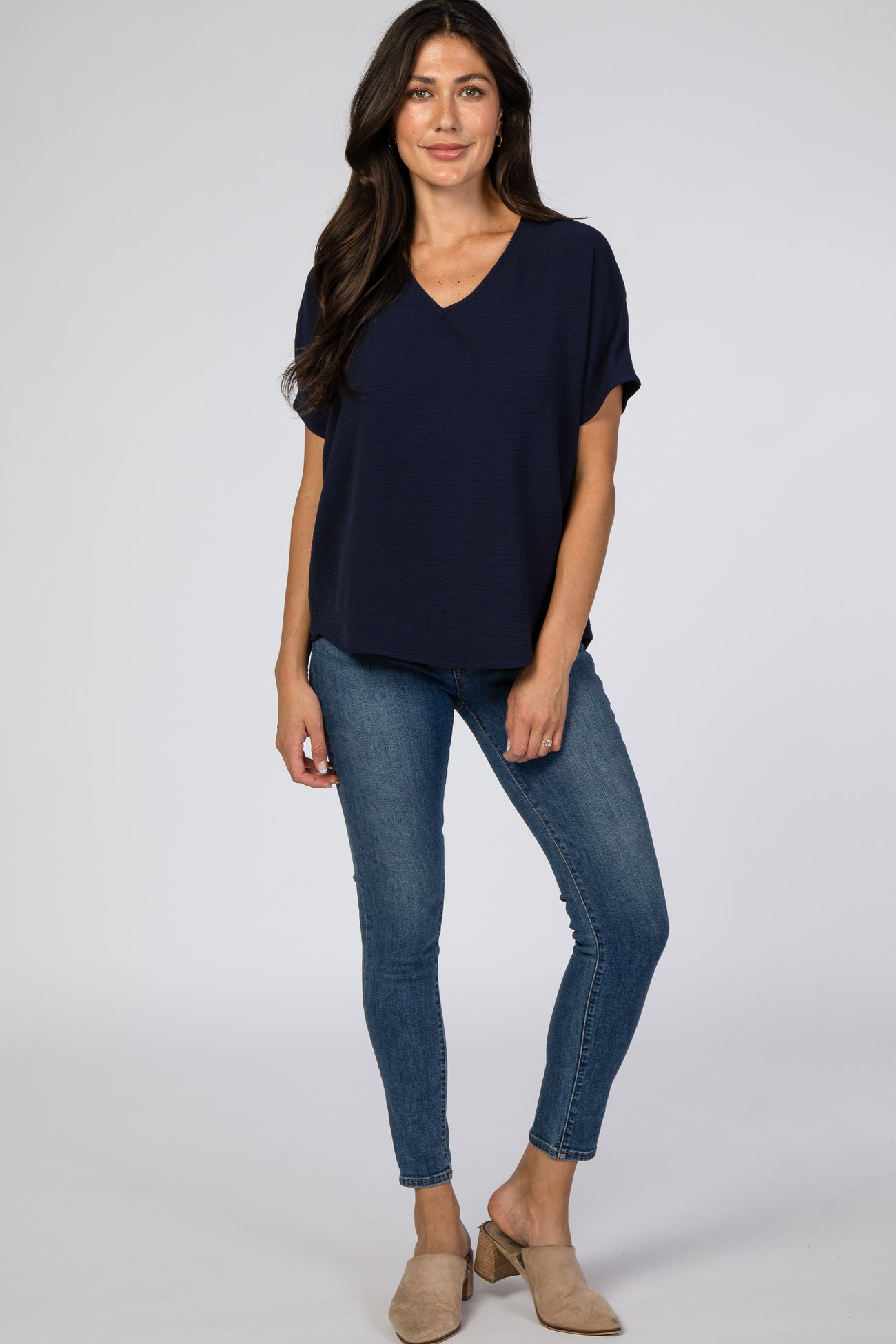 A solid hued blouse featuring short sleeves and a v-neckline.