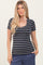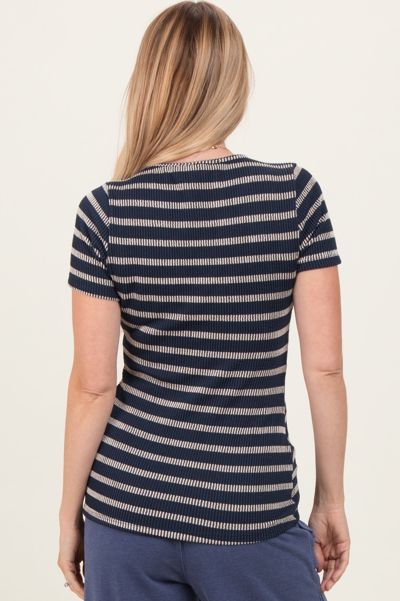 Elevate your casual wardrobe with our Navy Stripe Short Sleeve Round Neck Top. This chic piece features classic navy and beige horizontal stripes that create a timeless, versatile look. The ribbed knit fabric offers a flattering, form-fitting silhouette while ensuring comfort throughout the day. Designed with a unique round neckline, this top adds a subtle touch of style to your everyday outfits. Perfect for pairing with jeans, shorts, or casual trousers, it’s an essential staple for effortless layering or wearing on its own. Refresh your basics with this must-have nod to classic stripes.