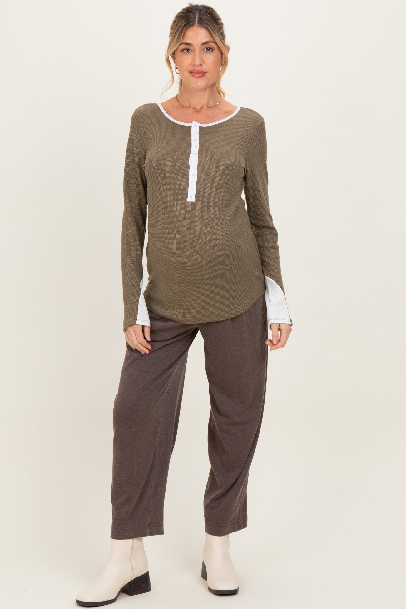 Stay comfortable and stylish throughout your pregnancy with our Olive Colorblock Snap Button Maternity Henley. Made from a soft, breathable waffle-knit fabric, this top features a flattering olive color with contrasting white trim and snap buttons for easy nursing access. The long sleeves and relaxed fit accommodate your growing bump while providing cozy warmth. Perfect for casual days or layering, this henley pairs effortlessly with your favorite maternity pants or leggings. Embrace comfort without sacrificing style in this must-have maternity essential.
