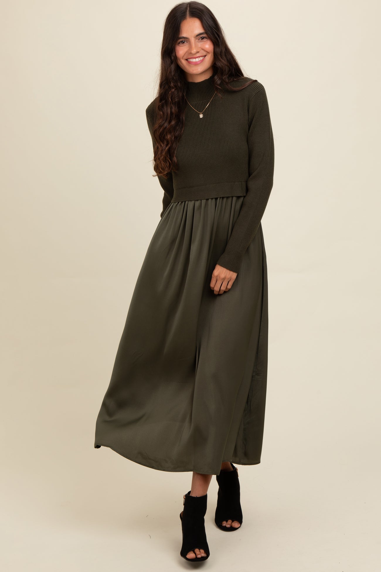 Elevate your wardrobe with the Olive Knit Contrast Top Satin Midi Dress—a perfect blend of cozy knitwear and luxurious satin. The fitted olive knit top features a subtle mock neck and long sleeves, complementing the flowing satin midi skirt for a refined silhouette. Ideal for transitional seasons, this dress effortlessly balances comfort and style, making it perfect for both casual outings and elegant occasions. Pair with ankle boots or heels to complete your look. Embrace timeless sophistication in rich olive tones that flatter all skin tones. Available in versatile sizes for a perfect fit.