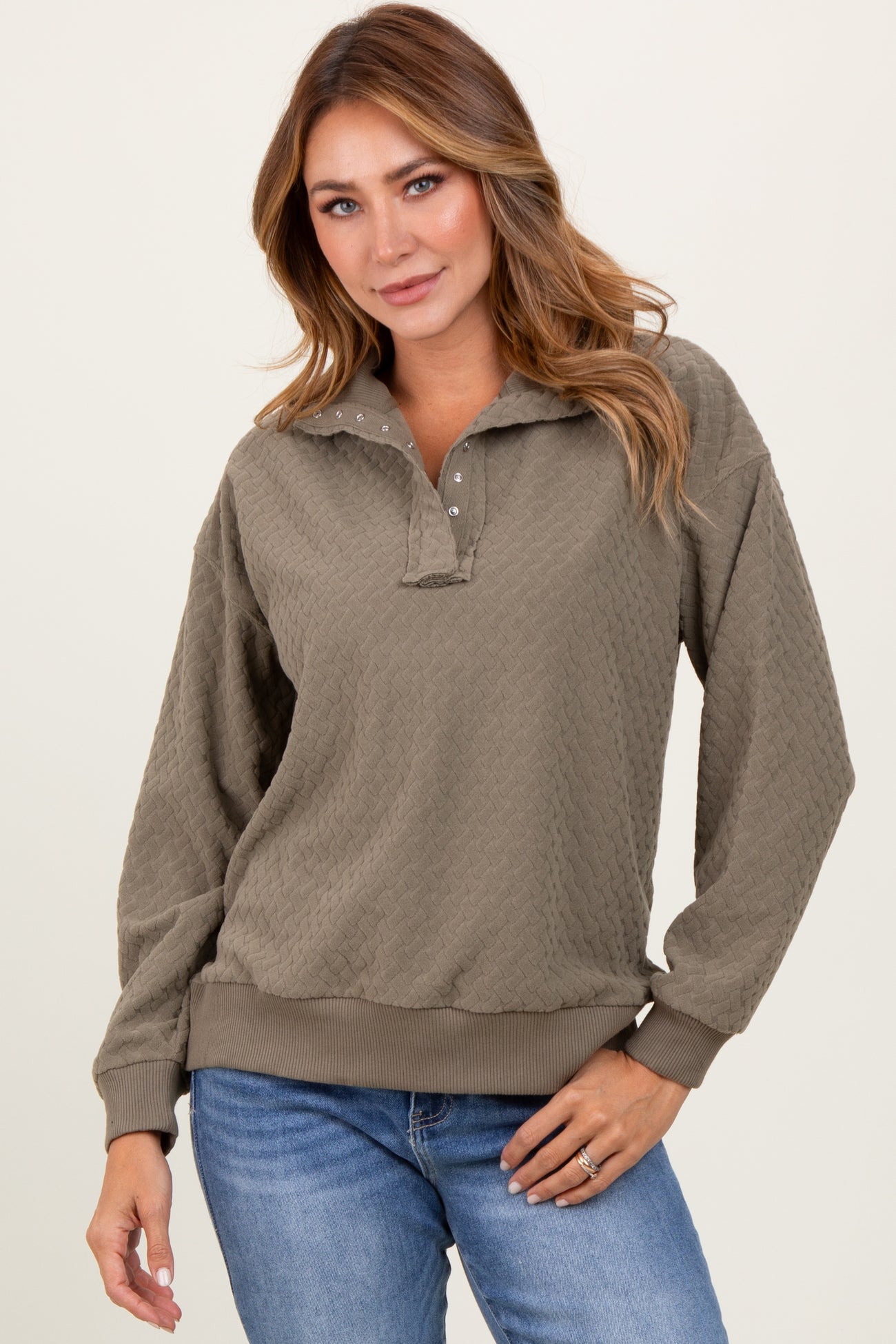 Cozy up in style with our Olive Quilted Knit Snap Collar Pullover Top. Featuring a unique quilted texture, this pullover offers both warmth and a trendy look. The snap collar detail adds a chic touch, allowing you to adjust your neckline with ease. Ribbed cuffs and hem provide a comfortable fit that stays in place, while the relaxed silhouette makes it perfect for layering or wearing solo. Whether you're running errands or enjoying a casual day out, this versatile olive top is a must-have addition to your wardrobe. Pair it with jeans or leggings for effortless style every day.