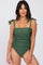 A solid hue swimsuit, featuring a straight neckline, adjustable shoulder tie straps, ruched sides, a double lining and removable padded cups.