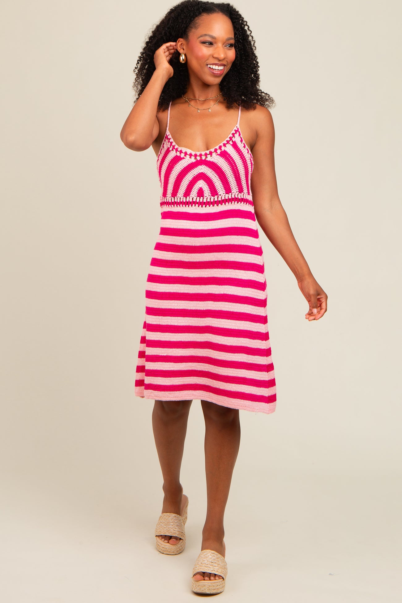 Pink Crochet Striped Sleeveless Dress