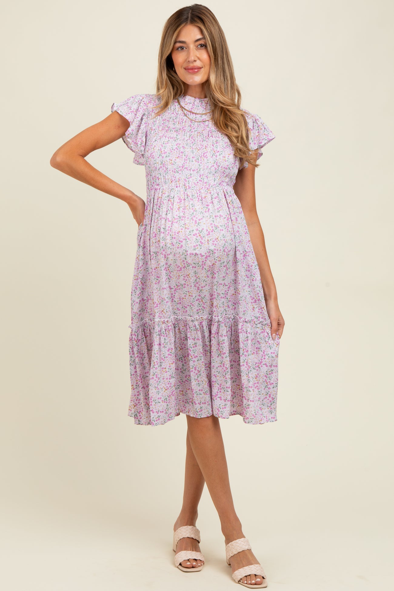 Pink Floral Mock Neck Smocked Ruffe Sleeve Maternity Midi Dress