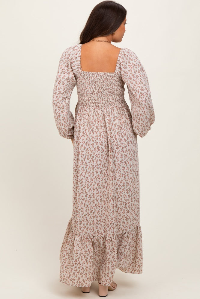 Pink Floral Smocked Lace Trim Sweetheart Maternity Maxi Dress