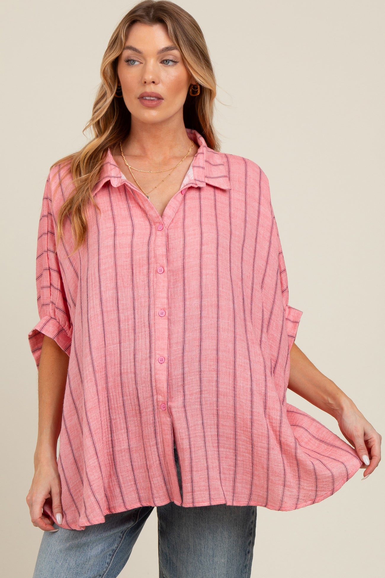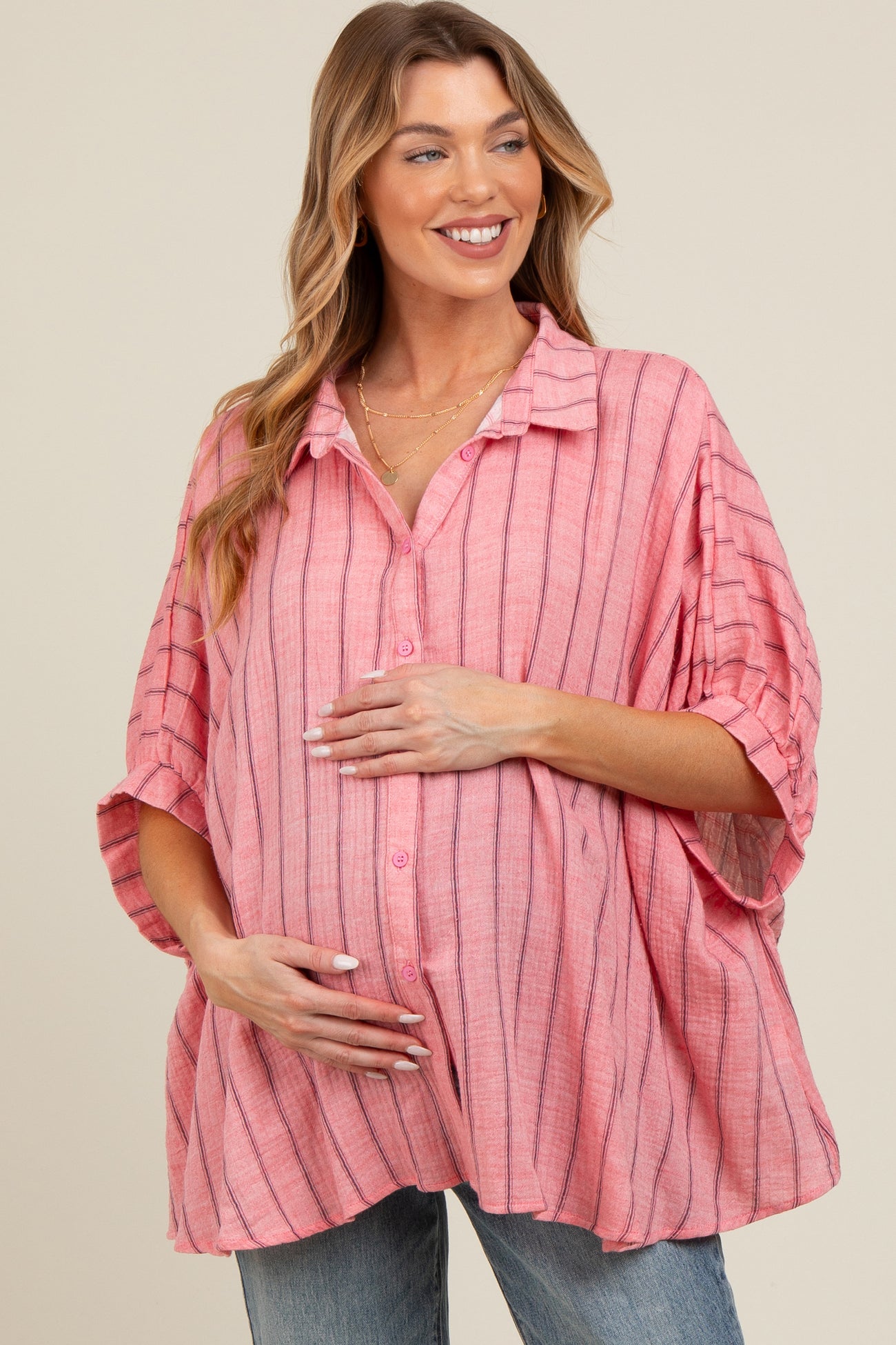 A striped maternity top featuring an oversized fit, a collared neckline, a button down front and short dolman sleeves.
