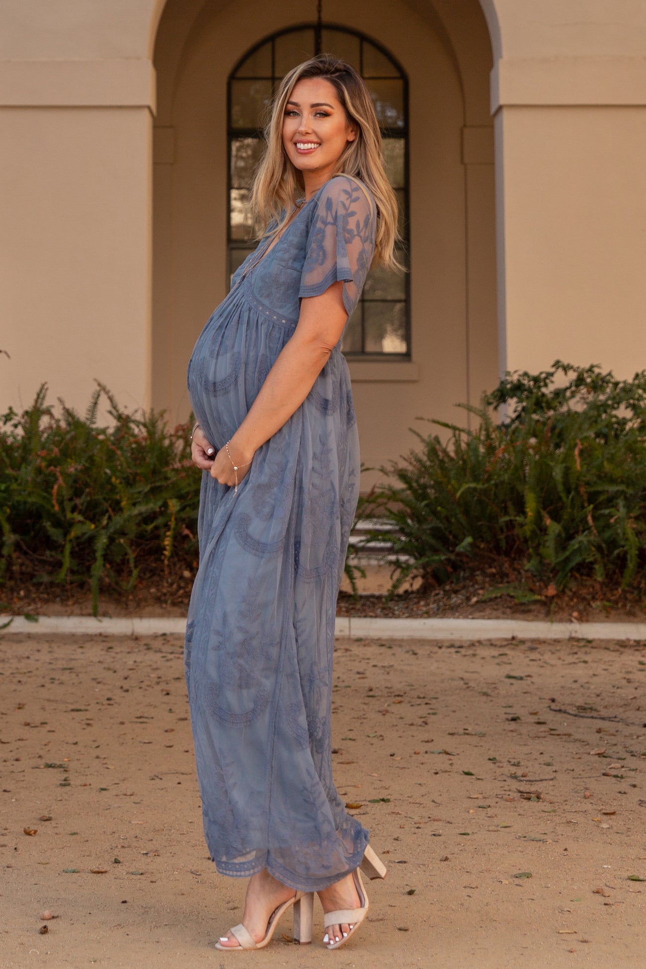 PinkBlush Blue Lace Mesh Overlay Maternity Maxi Dress