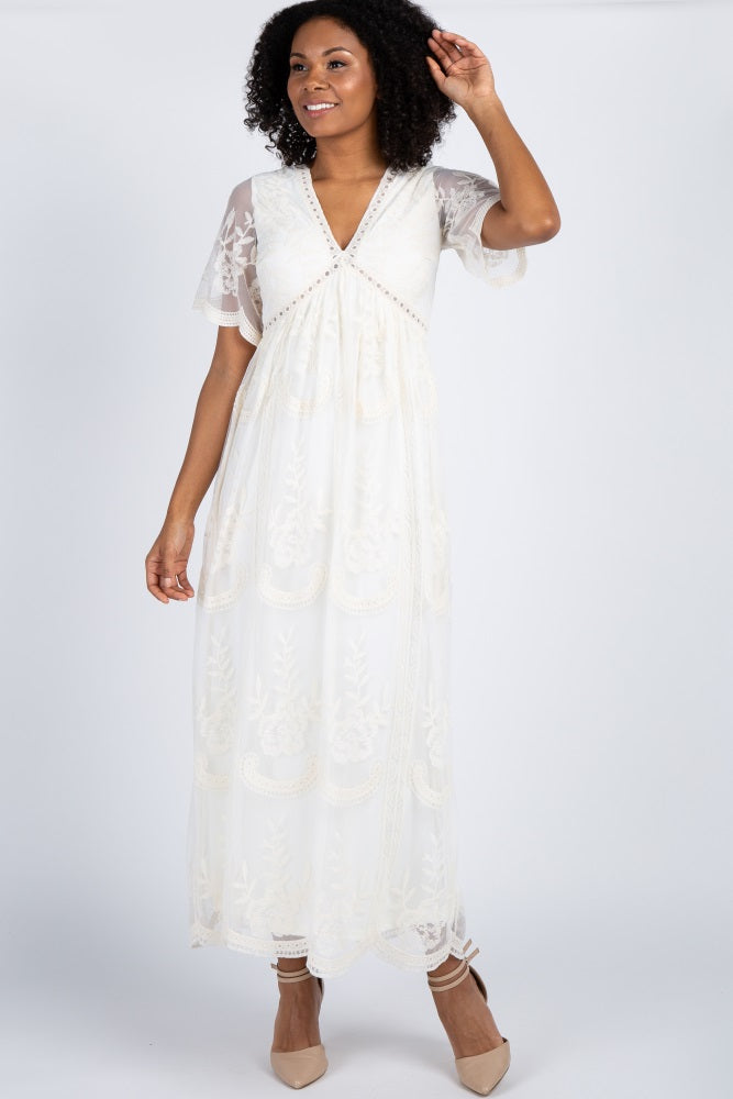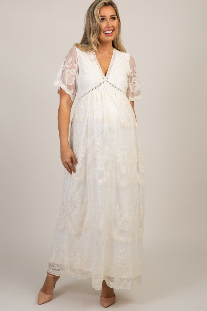 PinkBlush Cream Lace Mesh Overlay Maternity Maxi Dress