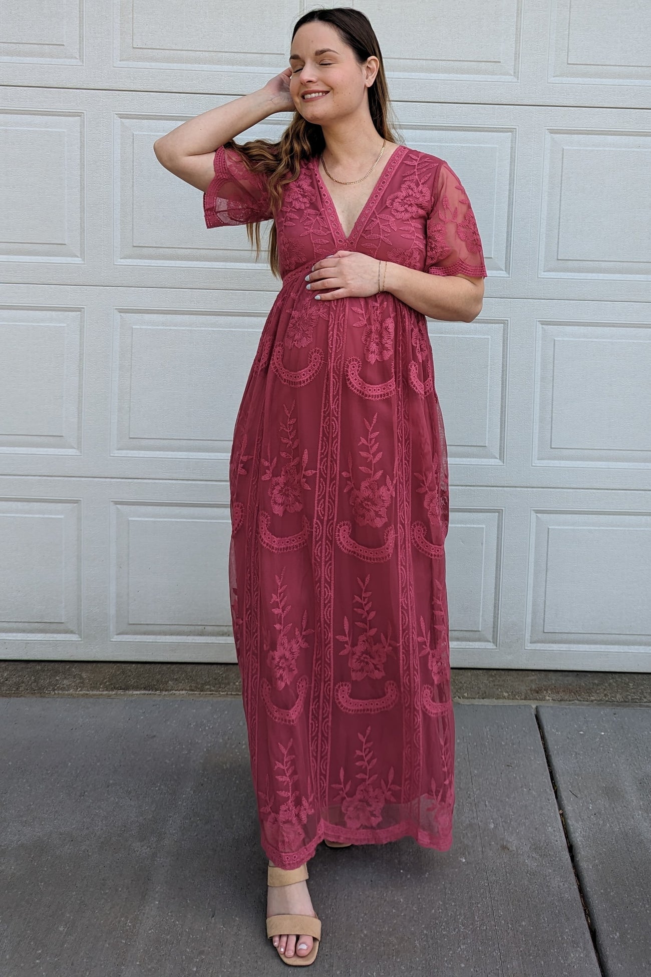 PinkBlush Magenta Lace Mesh Overlay Maternity Maxi Dress