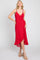 An animal print midi dress featuring a wrap v-neckline, an inside side button closure, double button accent at the waist, adjustable straps, and a flounce trim skirt.