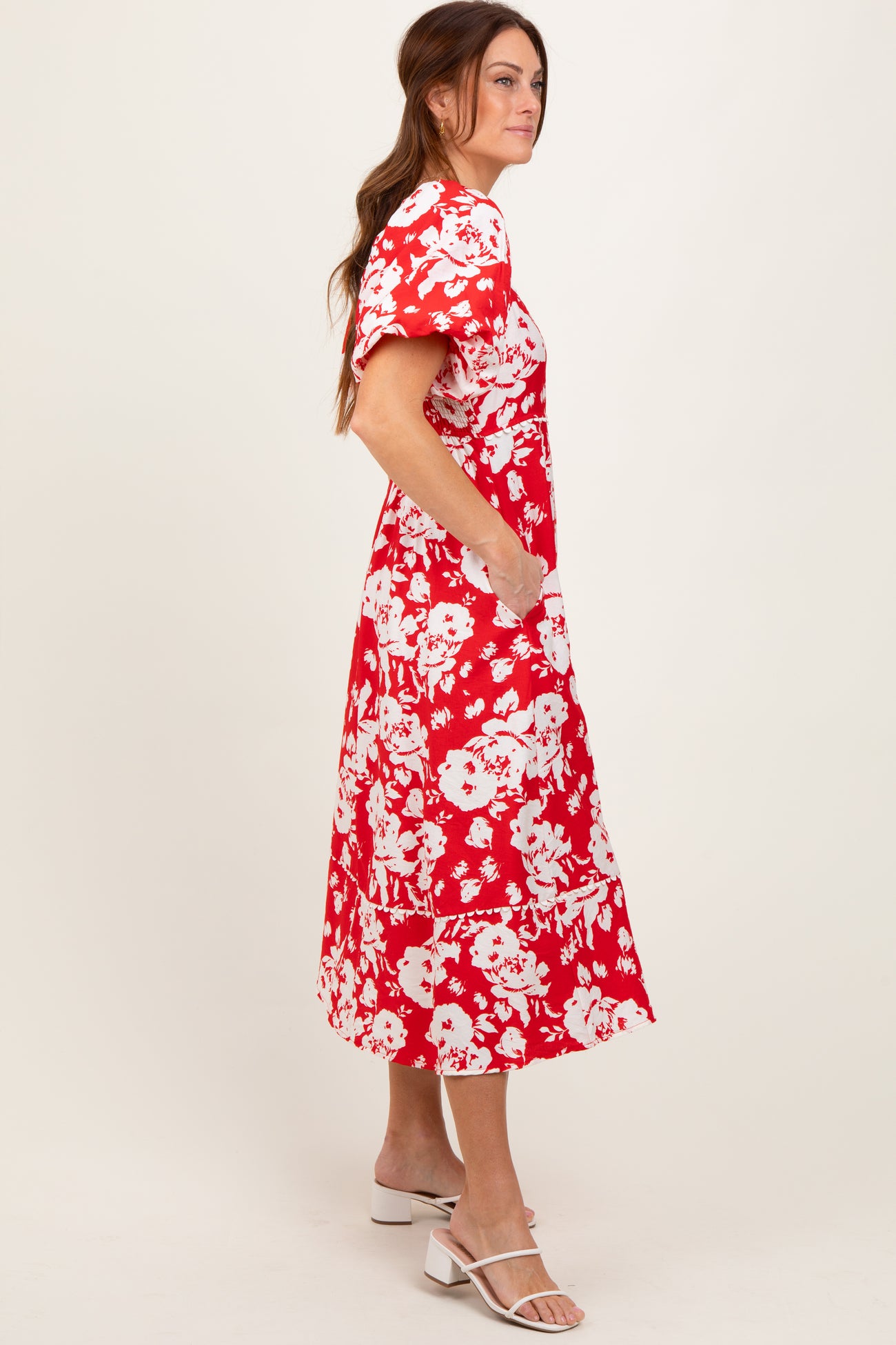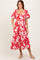 Red Floral Scallop Trim Puff Sleeve Midi Dress