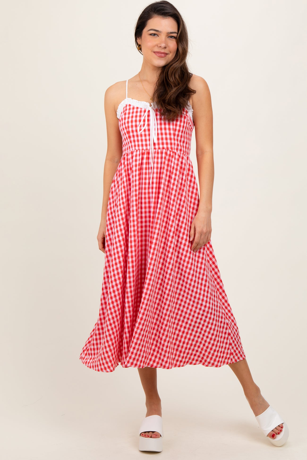 Red Gingham Smocked Trim Midi Dress
