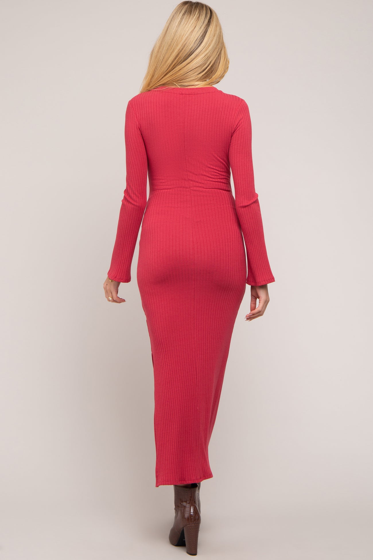 A solid ribbed basic maternity fitted long sleeve maxi dress with side slit detail.